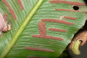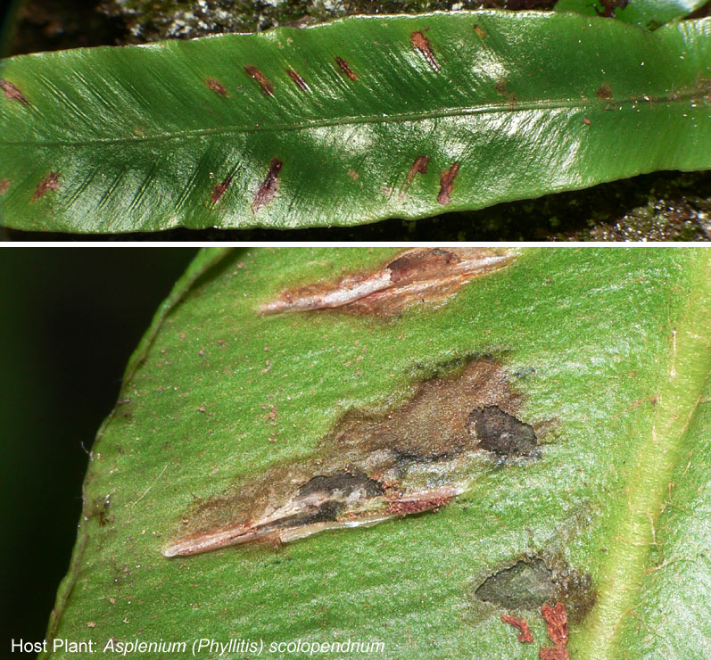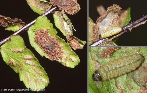 Bei einem Besuch des Serriger Tals westlich Serrig (auf der linken Saarseite nördl. der Siedlung Staadt) fielen mir nun (19. Feb. 2011) braun verfärbte Fiederblättchen an einem Farnstock des Braunstieligen Streifenfarn Asplenium trichomanes auf, die mich zur näheren Musterung animierten. Auf den Blattunterseiten befanden sich vergleichsweise auffällige „Riesensori“, die Tarndecken der Raupen. Wenn man etwas Geduld aufbringt, kann man sehen, dass sich die Riesensori bewegen und dabei der Kopf der Raupe am Rande gelegentlich auftaucht.